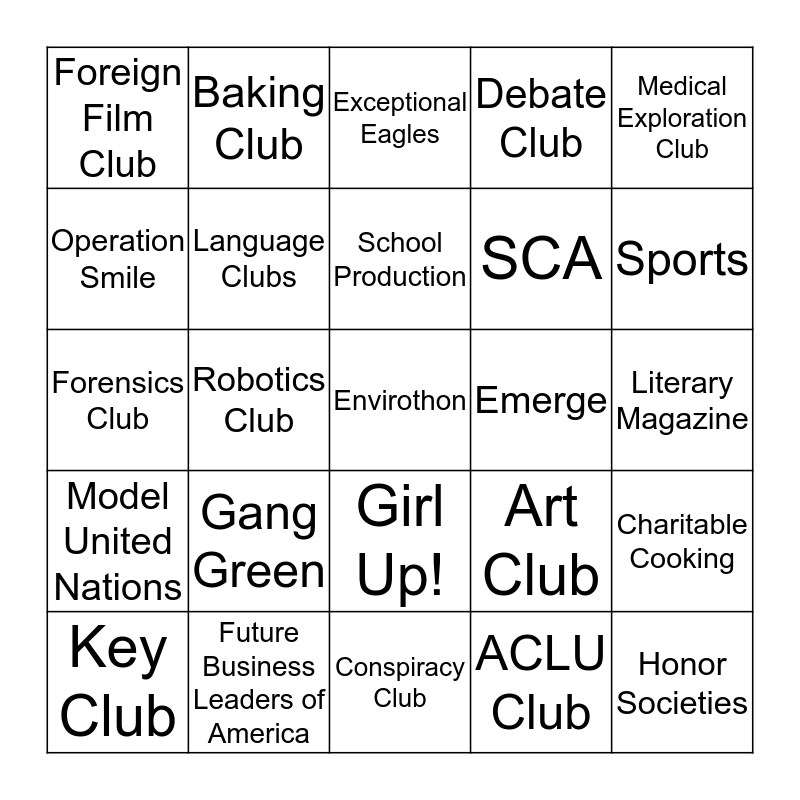 This bingo card has a free space and 24 words: Gang Green, Future Business Leaders of America, School Production, Key Club, Medical Exploration Club, Foreign Film Club, Operation Smile, Baking Club, Emerge, Girl Up!, SCA, Forensics Club, Art Club, Charitable Cooking, Language Clubs, ACLU Club, Literary Magazine, Exceptional Eagles, Sports, Robotics Club, Honor Societies, Model United Nations, Debate Club and Conspiracy Club.
