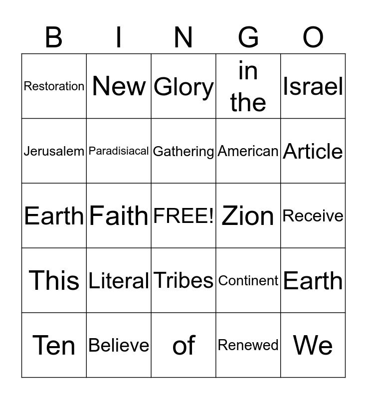 This bingo card has a free space and 24 words: Literal, Believe, Gathering, Ten, Israel, Restoration, Jerusalem, New, Zion, Tribes, American, Earth, Continent, Earth, Paradisiacal, Renewed, Receive, Glory, Article, Faith, We, This, in the and of.