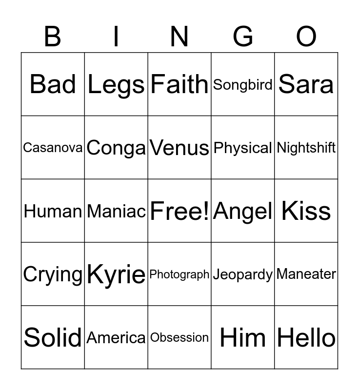 This bingo card has a free space and 80 words: Cherish, Stand, Faith, Kokomo, Monkey, Desire, Valerie, Wait, Alone, Always, Notorious, Luka, Songbird, Bad, Breakout, Casanova, Victory, Kyrie, Never, Kiss, Sledgehammer, Sara, Human, Venus, Conga, Amanda, Shout, Heaven, Loverboy, Lovergirl, Nightshift, Sussudio, Obsession, Misled, Solid, Angel, Fresh, Footloose, Jump, Hello, Ghostbusters, Joanna, Boderline, Drive, Automatic, Legs, Thriller, Holiday, Tonight, Magic, Maneater, Maniac, Jeopardy, Africa, Mickey, 1999, Truly, Gloria, Heartbreaker, Photograph, Physical, Centerfold, Rosanna, Trouble, Vacation, Lady, Rapture, Woman, Elvira, Urgent, Crying, America, Sailing, Abracadabra, Babe, Stomp, Him, Fame, Refugee and Passion.