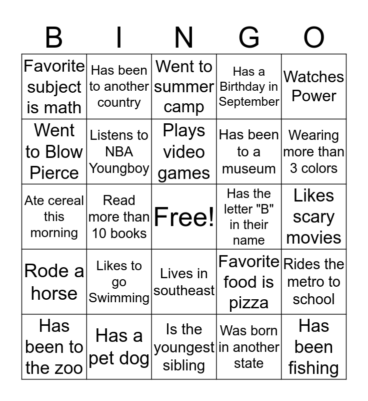 This bingo card has a free space and 24 words: Likes to go Swimming, Has a pet dog, Plays video games, Has been to the zoo, Watches Power, Favorite subject is math, Went to Blow Pierce, Has been to another country, Has the letter "B" in their name, Lives in southeast, Has been to a museum, Ate cereal this morning, Favorite food is pizza, Rides the metro to school, Listens to NBA Youngboy, Was born in another state, Likes scary movies, Went to summer camp, Wearing more than 3 colors, Read more than 10 books, Has been fishing, Rode a horse, Has a Birthday in September and Is the youngest sibling.