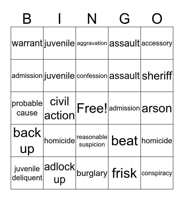 This bingo card has a free space and 30 words: adlock up, robbery, civil action, detective, warrant, aggravation, juvenile, reasonable suspicion, admission, burglary, arson, conspiracy, frisk, controlled substance, sheriff, statue of limitations, beat, back up, homicide, accessory, probable cause, extradition, juvenile, assault, admission, assault, homicide, juvenile deliquent, confession and manslaughter.