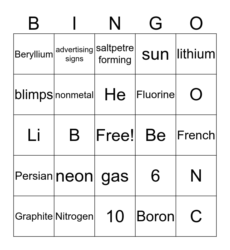 This bingo card has a free space and 35 words: H, Hydrogen, 1, nonmetal, gas, sun, blimps, 2, He, Solid, Li, lithium, transfer applications, 4, Beryllium, Be, Boron, B, Persian, C, 6, Graphite, N, Nitrogen, saltpetre forming, O, 8, earth's atmosphere, Fluorine, French, Tooth decay, 10, neon, advertising signs and Na.