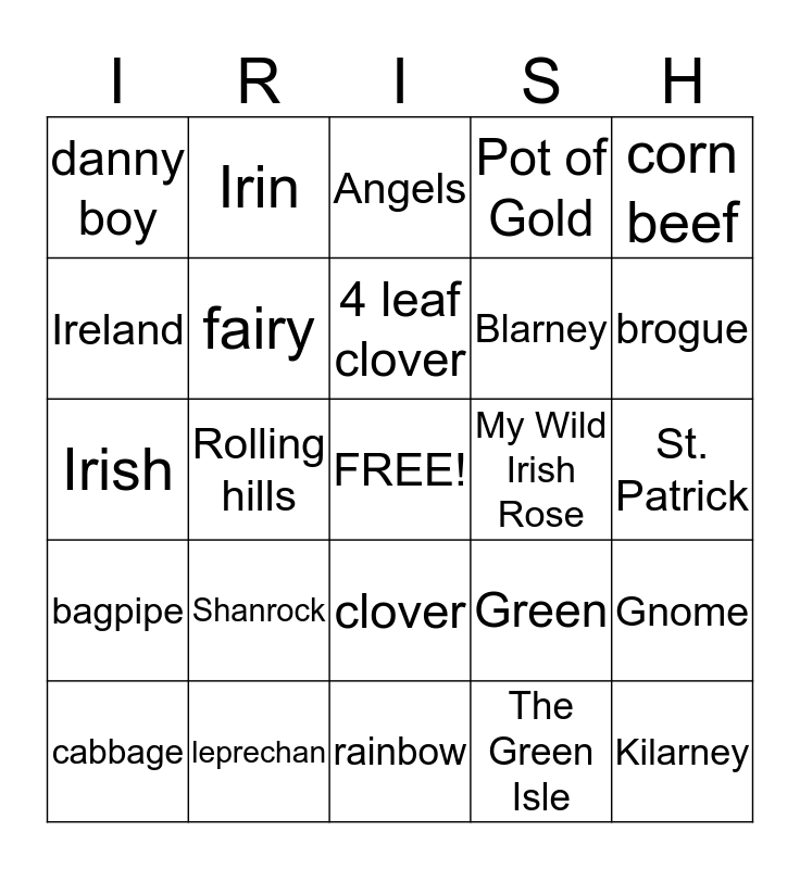 This bingo card has a free space and 24 words: Shanrock, leprechan, 4 leaf clover, cabbage, corn beef, danny boy, Ireland, Irin, My Wild Irish Rose, clover, Blarney, Irish, Green, Gnome, fairy, The Green Isle, St. Patrick, Angels, brogue, Rolling hills, Kilarney, bagpipe, Pot of Gold and rainbow.