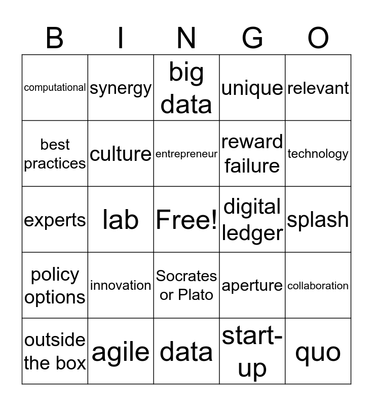 This bingo card has a free space and 24 words: outside the box, innovation, entrepreneur, start-up, relevant, computational, synergy, big data, digital ledger, splash, experts, culture, aperture, collaboration, best practices, agile, data, unique, technology, policy options, lab, Socrates or Plato, reward failure and quo.