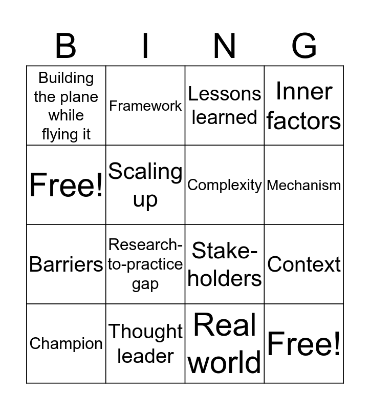 This bingo card has 16 words: Thought leader, Context, Lessons learned, Building the plane while flying it, Barriers, Framework, Stake-holders, Real world, Free!, Scaling up, Champion, Inner factors, Research-to-practice gap, Mechanism, Complexity and Free!.