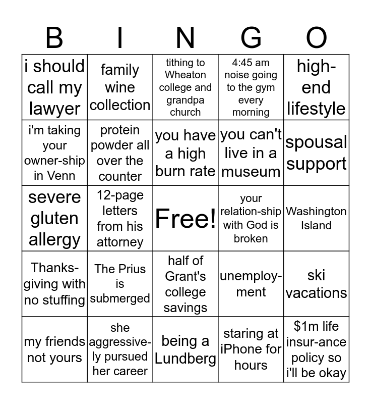 This bingo card has a free space and 24 words: The Prius is submerged, she aggressive-ly pursued her career, you have a high burn rate, my friends not yours, high-end lifestyle, i should call my lawyer, i'm taking your owner-ship in Venn, family wine collection, your relation-ship with God is broken, half of Grant's college savings, you can't live in a museum, severe gluten allergy, unemploy-ment, ski vacations, protein powder all over the counter, staring at iPhone for hours, Washington Island, tithing to Wheaton college and grandpa church, spousal support, 12-page letters from his attorney, $1m life insur-ance policy so i'll be okay, Thanks-giving with no stuffing, 4:45 am noise going to the gym every morning and being a Lundberg.