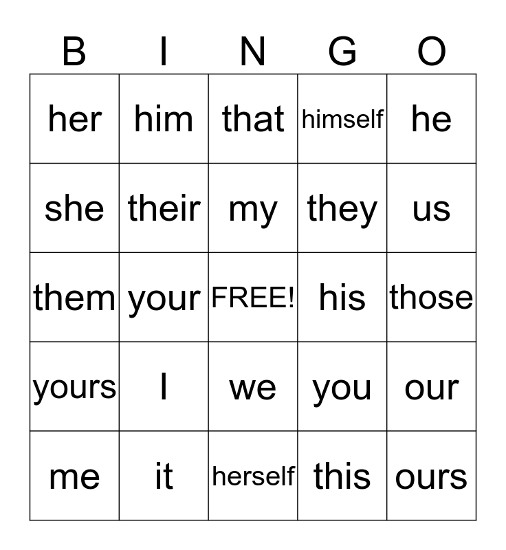 This bingo card has a free space and 24 words: I, it, my, me, he, her, she, him, his, we, they, them, you, our, their, this, those, that, us, your, ours, yours, himself and herself.