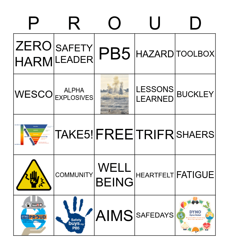 This bingo card has 6 images, a free space and 23 words: DYNO NOBEL PROUD, TAKE5!, VALUES, ZERO HARM, PB5, ALPHA EXPLOSIVES, COMMUNITY, TRIFR, SHAERS, AIMS, SAFEDAYS, BUCKLEY, DNTI, WELL BEING, TOOLBOX, HEARTFELT, ONBASE, LESSONS LEARNED, WESCO, HAZARD, SAFETY LEADER, FATIGUE and ASSET CARE.