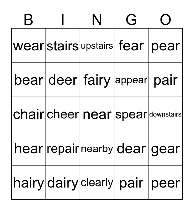 This bingo card has a free space and 24 words: repair, dairy, fairy, hairy, pear, wear, bear, stairs, spear, nearby, appear, chair, dear, gear, deer, pair, downstairs, upstairs, pair, cheer, peer, hear, fear and clearly.
