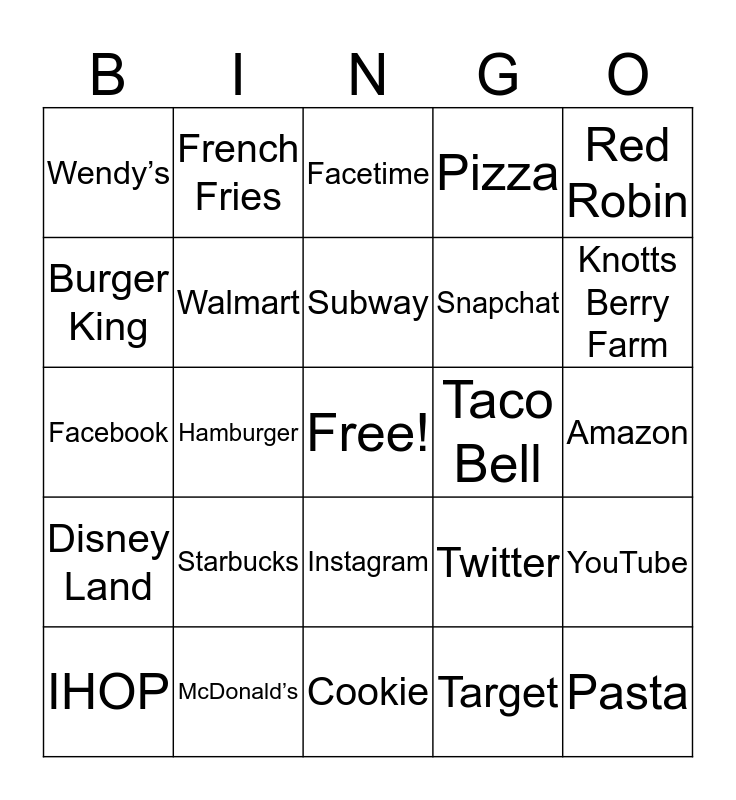 This bingo card has a free space and 24 words: Starbucks, McDonald’s, Subway, IHOP, Red Robin, Wendy’s, Burger King, French Fries, Taco Bell, Instagram, Snapchat, Facebook, Twitter, YouTube, Walmart, Target, Amazon, Facetime, Knotts Berry Farm, Hamburger, Pasta, Disney Land, Pizza and Cookie.