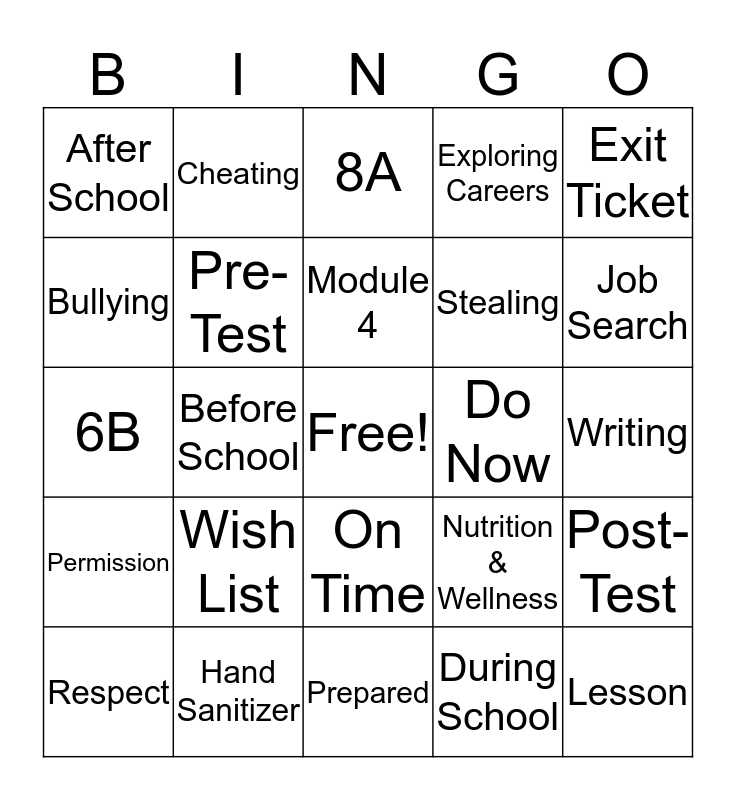 This bingo card has a free space and 49 words: Set, Lesson, Closure, Prepared, Wish List, Time, Cheating, Fair, Bullying, YOU, Pre-Test, Exploring Careers, Post-Test, Nutrition & Wellness, Module 3, Module 2, Module 4, Do Now, Lecture, Exit Ticket, Before School, During School, After School, Stealing, 333, Job Search, Respect, Best Effort, On Time, Permission, Cell Phones, Daily Folder, Bathroom, Kleenex, Hand Sanitizer, Clorox Wipes, Paper Towels, Reading, Writing, Art, Math, 7A, 7B, 6A, 6B, 8A, 8B, Ram Time and Club Day.