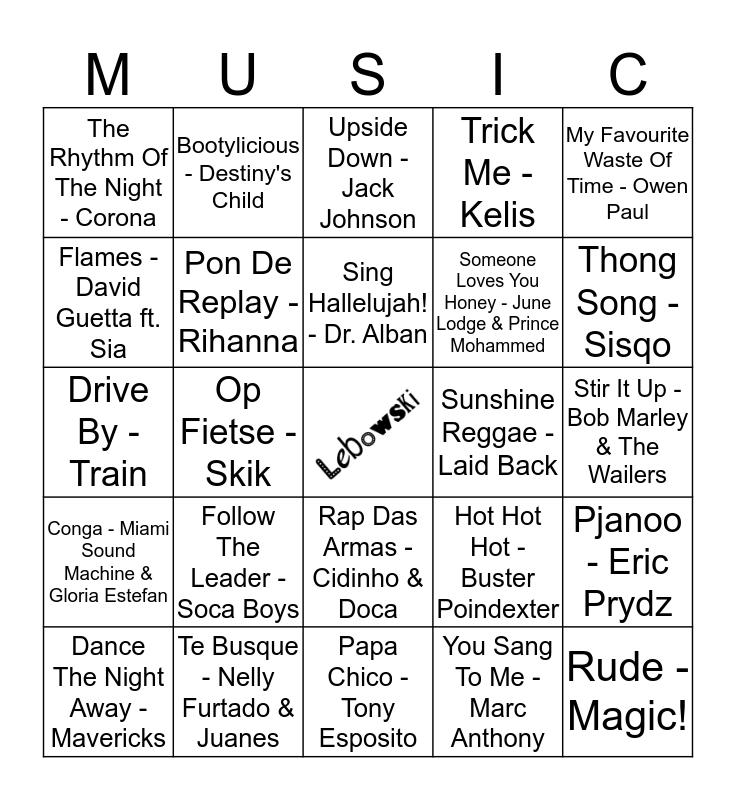 This bingo card has a free space and 24 words: Follow The Leader - Soca Boys, Te Busque - Nelly Furtado & Juanes, Sing Hallelujah! - Dr. Alban, Dance The Night Away - Mavericks, My Favourite Waste Of Time - Owen Paul, The Rhythm Of The Night - Corona, Flames - David Guetta ft. Sia, Bootylicious - Destiny's Child, Sunshine Reggae - Laid Back, Rap Das Armas - Cidinho & Doca, Someone Loves You Honey - June Lodge & Prince Mohammed, Drive By - Train, Hot Hot Hot - Buster Poindexter, Pjanoo - Eric Prydz, Pon De Replay - Rihanna, You Sang To Me - Marc Anthony, Stir It Up - Bob Marley & The Wailers, Upside Down - Jack Johnson, Thong Song - Sisqo, Op Fietse - Skik, Rude - Magic!, Conga - Miami Sound Machine & Gloria Estefan, Trick Me - Kelis and Papa Chico - Tony Esposito.