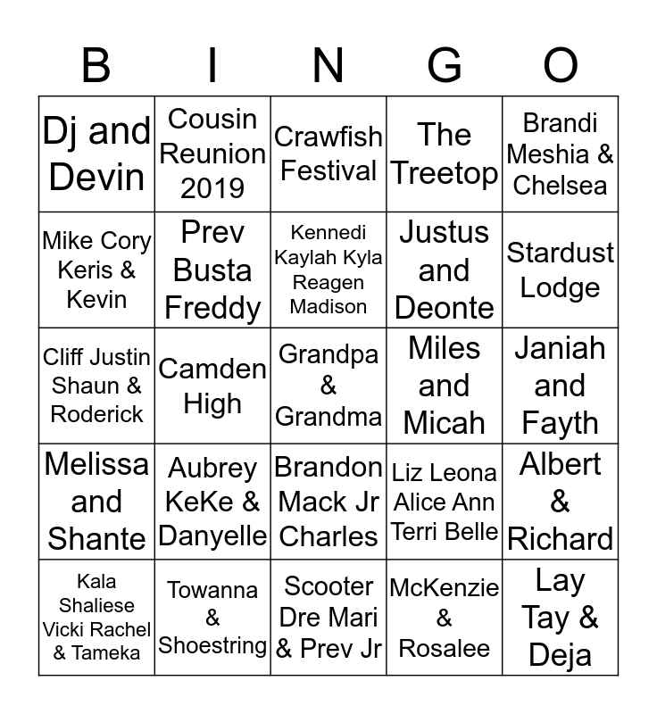 This bingo card has a free space and 24 words: Aubrey KeKe & Danyelle, Towanna & Shoestring, Kennedi Kaylah Kyla Reagen Madison, Kala Shaliese Vicki Rachel & Tameka, Brandi Meshia & Chelsea, Dj and Devin, Mike Cory Keris & Kevin, Cousin Reunion 2019, Miles and Micah, Brandon Mack Jr Charles, Justus and Deonte, Cliff Justin Shaun & Roderick, Liz Leona Alice Ann Terri Belle, Albert & Richard, Prev Busta Freddy, McKenzie & Rosalee, Janiah and Fayth, Crawfish Festival, Stardust Lodge, Camden High, Lay Tay & Deja, Melissa and Shante, The Treetop and Scooter Dre Mari & Prev Jr.