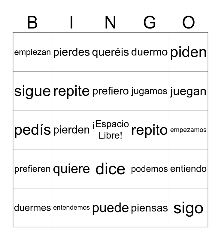 This bingo card has a free space and 24 words: quiere, entendemos, prefiero, duermes, piden, empiezan, sigue, pierdes, repito, dice, jugamos, pedís, podemos, entiendo, repite, piensas, empezamos, queréis, juegan, pierden, sigo, prefieren, duermo and puede.