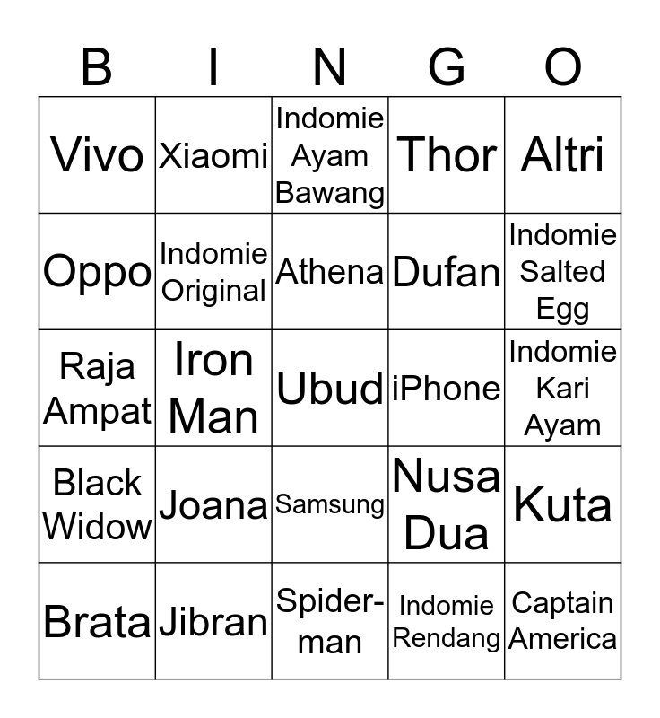 This bingo card has a free space and 24 words: Joana, Jibran, Athena, Brata, Altri, Vivo, Oppo, Xiaomi, iPhone, Samsung, Dufan, Raja Ampat, Nusa Dua, Kuta, Indomie Original, Indomie Rendang, Indomie Kari Ayam, Indomie Ayam Bawang, Indomie Salted Egg, Iron Man, Captain America, Black Widow, Thor and Spider-man.
