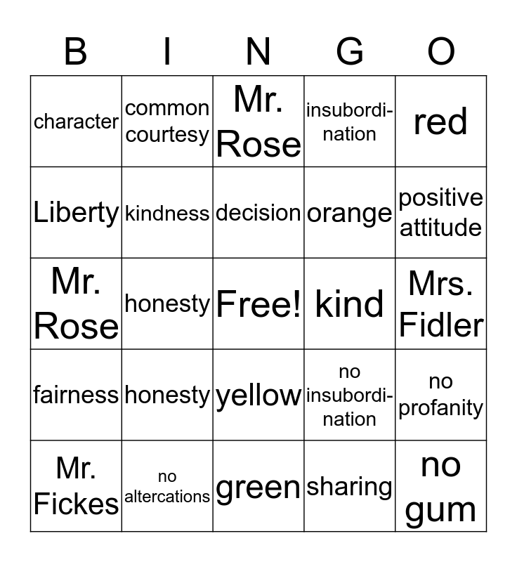 This bingo card has a free space and 34 words: common sense, sharing, Pride at Liberty, Mr. Logan, fairness, kindness, red, Mr. Fickes, common courtesy, right, decision, Mr. Rose, success, problem, kind, positive attitude, no altercations, Mr. Rose, honesty, no insubordi- nation, yellow, empathy, character, Mrs. Fidler, green, no gum, insubordi-nation, jaguar, orange, Liberty, no vandalism, honesty, no profanity and common respect.