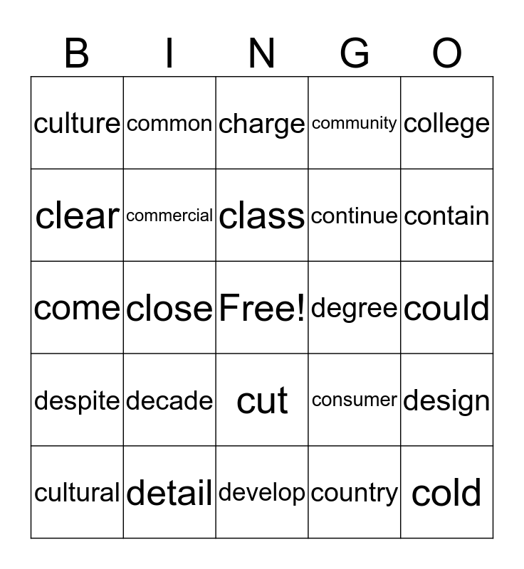 This bingo card has a free space and 75 words: change, character, charge, check, child, choice, choose, church, citizen, city, civil, claim, class, clear, clearly, close, coach, cold, collection, college, color, come, commercial, common, community, company, compare, computer, concern, condition, conference, Congress, consider, consumer, contain, continue, control, cost, could, country, couple, course, court, cover, create, crime, cultural, culture, cup, current, customer, cut, dark, data, daughter, day, dead, deal, death, debate, decade, decide, decision, deep, defense, degree, Democrat, democratic, describe, design, despite, detail, determine, develop and development.