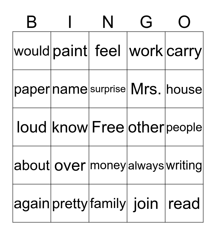 This bingo card has a free space and 24 words: over, pretty, surprise, again, carry, would, paper, paint, other, money, Mrs., loud, always, writing, name, join, people, feel, house, know, read, about, work and family.