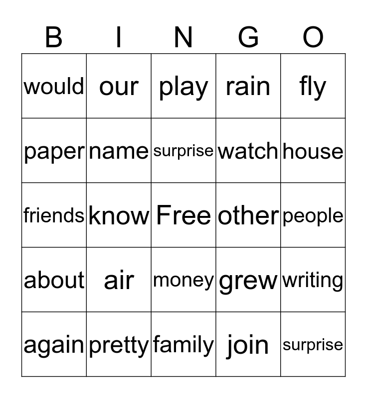 This bingo card has a free space and 24 words: air, pretty, surprise, again, fly, would, paper, our, other, money, watch, friends, grew, writing, name, join, people, play, house, know, surprise, about, rain and family.