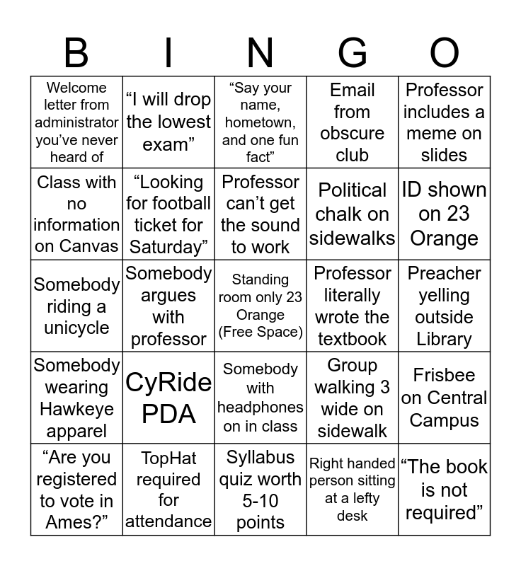 This bingo card has a free space and 24 words: CyRide PDA, TopHat required for attendance, Professor can’t get the sound to work, “Are you registered to vote in Ames?”, Professor includes a meme on slides, Welcome letter from administrator you’ve never heard of, Class with no information on Canvas, “I will drop the lowest exam”, Professor literally wrote the textbook, Somebody with headphones on in class, Political chalk on sidewalks, Somebody riding a unicycle, Group walking 3 wide on sidewalk, Frisbee on Central Campus, “Looking for football ticket for Saturday”, Right handed person sitting at a lefty desk, Preacher yelling outside Library, “Say your name, hometown, and one fun fact”, ID shown on 23 Orange, Somebody argues with professor, “The book is not required”, Somebody wearing Hawkeye apparel, Email from obscure club and Syllabus quiz worth 5-10 points.