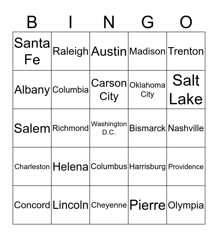 This bingo card has a free space and 24 words: Helena, Lincoln, Carson City, Concord, Trenton, Santa Fe, Albany, Raleigh, Bismarck, Columbus, Oklahoma City, Salem, Harrisburg, Providence, Columbia, Pierre, Nashville, Austin, Salt Lake, Richmond, Olympia, Charleston, Madison and Cheyenne.