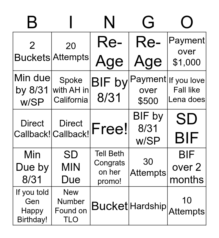 This bingo card has a free space and 24 words: If you told Gen Happy Birthday!, SD MIN Due, BIF by 8/31, Hardship, Payment over $1,000, 2 Buckets, 20 Attempts, Re-Age, BIF by 8/31 w/SP, SD BIF, Direct Callback!, Spoke with AH in California, 30 Attempts, BIF over 2 months, Min due by 8/31 w/SP, New Number Found on TLO, Bucket, Re-Age, If you love Fall like Lena does, Min Due by 8/31, Direct Callback!, Tell Beth Congrats on her promo!, Payment over $500 and 10 Attempts.