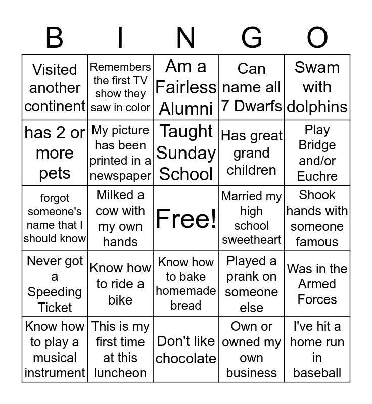 This bingo card has a free space and 29 words: Know how to play a musical instrument, Jumped out of an airplane, Milked a cow with my own hands, Can speak a foreign language, Visited another continent, Am a Fairless Alumni, My picture has been printed in a newspaper, Know how to ride a bike, Married my high school sweetheart, This is my first time at this luncheon, Shook hands with someone famous, I've hit a home run in baseball, Don't like chocolate, Own or owned my own business, Play Bridge and/or Euchre, Participated in a mission trip, Know how to bake homemade bread, Never got a Speeding Ticket, Swam with dolphins, forgot someone's name that I should know, Played a prank on someone else, Played sports in high school, Has great grand children, has 2 or more pets, Can name all 7 Dwarfs, Remembers the first TV show they saw in color, Was in the Armed Forces, Taught Sunday School and Visited McKinley Monument.