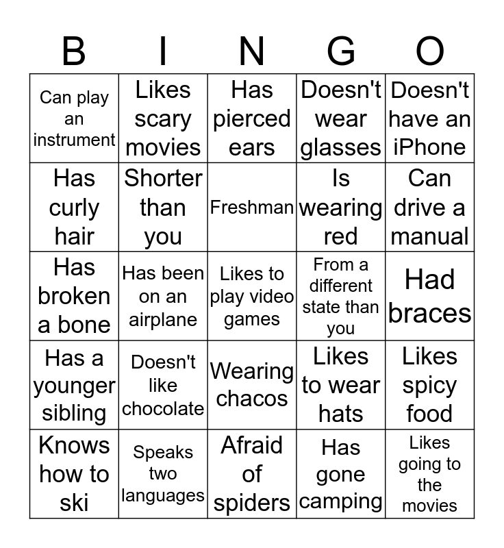 This bingo card has 35 words: Is left handed, Has blue eyes, Different major than you, Shorter than you, Wearing chacos, Doesn't wear glasses, Has curly hair, Milligan athlete, Freshman, Loves pizza, Has broken a bone, Doesn't have an iPhone, Likes to cook, Has brown hair, Can play an instrument, From a different state than you, Has gone camping, Has been on an airplane, Has a younger sibling, Likes to play video games, Likes to wear hats, Knows how to ski, Likes spicy food, Speaks two languages, Has pierced ears, Can drive a manual, Likes going to the movies, Is allergic to some kind of food, Is wearing red, Had braces, Loves country music, Afraid of spiders, Doesn't like chocolate, Likes scary movies and Born the same month as you.
