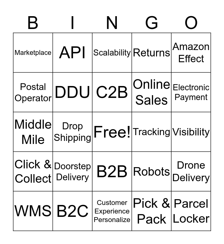 This bingo card has a free space and 41 words: First Mile, Middle Mile, DDP, DDU, B2C, B2B, C2B, C2C, Amazon Effect, Click & Collect, Drop Shipping, Returns, Parcel Locker, Visibility, Tracking, Doorstep Delivery, FBA, Marketplace, Shipping Platform, Scalability, Drone Delivery, Autonomous Vehicles, Customer Experience Personalize, Online Sales, Ecosystem, Big Data, Pick & Pack, Local Distribution, Electronic Payment, eCommerce, Data Transfer, API, WMS, TMS, Robots, Postal Operator, COD, B2C Clearance, Threshold, VAT system and Section 321.