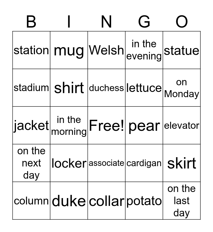 This bingo card has a free space and 24 words: locker, duke, duchess, column, statue, station, stadium, mug, pear, associate, lettuce, jacket, cardigan, skirt, shirt, potato, elevator, Welsh, on Monday, in the morning, on the last day, on the next day, in the evening and collar.