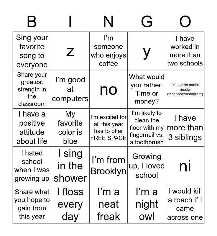 This bingo card has a free space and 29 words: Share what you hope to gain from this year, I’m a listener (vs. being a talker), My favorite color is blue, Name all 7 of our Rebbeim and their Rebbetzin, Sing your favorite song to everyone, I’m someone who enjoys coffee, I’m good at computers, I sing in the shower, I’m likely to clean the floor with my fingernail vs. a toothbrush, I floss every day, I have more than 3 siblings, I would kill a roach if I came across one, I’m a neat freak, I’m a night owl, I’m not on social media (facebook/Instagram), I’m the winner of rock, paper, scissor , I’m from Brooklyn, I hated school when I was growing up, I have worked in more than two schools, I have a positive attitude about life, Growing up, I loved school, I have always wanted to teach, What would you rather: Time or money?, Share your greatest strength in the classroom, y, z, ni, no and ne.