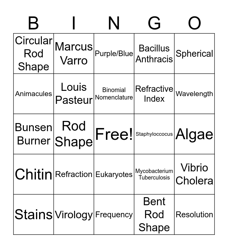 This bingo card has a free space and 49 words: Magnification, Resolution, Amplitude, Frequency, Refraction, Hippocrates, Marcus Varro, Anton Van Leeuwenhoek, Animacules, Wee Little Beasties, Louis Pasteur, Bacillus Anthracis, Vibrio Cholera, Mycobacterium Tuberculosis, Robert Koch, Carolus Linneaus, Binomial Nomenclature, Staphyloccocus, Cloaca Maxima, Spherical, Rod Shape, Bent Rod Shape, Circular Rod Shape, Refractive Index, Numerical aperture, Wavelength, Stains, Prokaryotes, Eukaryotes, Chitin, Viruses, Bacteriology, Mycology, Protozoology, Virology, Parasitology, Yeast, Molds/Mushrooms, Algae, Photosynthesis, Eukarya, Growth Media, Petri Dish, Test Tubes, Bunsen Burner, Purple/Blue, Pink/Red, Immersion and Microscopes.