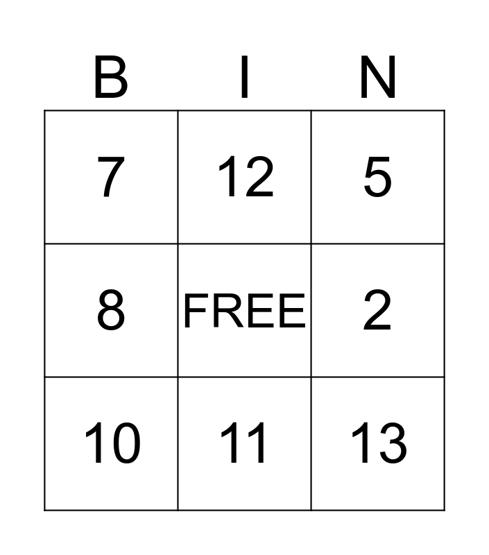This bingo card has a free space and 15 words: 1, 3, 5, 7, 11, 13, 15, 9, 2, 4, 6, 8, 10, 12 and 14.