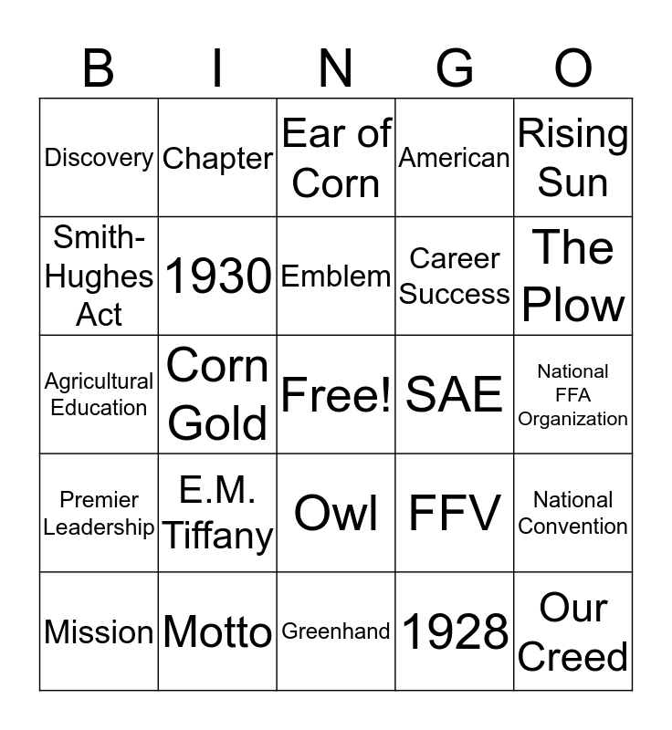 This bingo card has a free space and 29 words: Mission, National Blue, Corn Gold, Corduroy Jack, Discovery, Ear of Corn, 1930, E.M. Tiffany, SAE, Motto, National FFA Organization, Our Creed, Greenhand, 1928, The Plow, Personal Growth, Owl, Premier Leadership, Rising Sun, Agricultural Education, FFV, 1969, Career Success, Smith-Hughes Act, American, Chapter, National Convention, Emblem and Emblem of Washington.