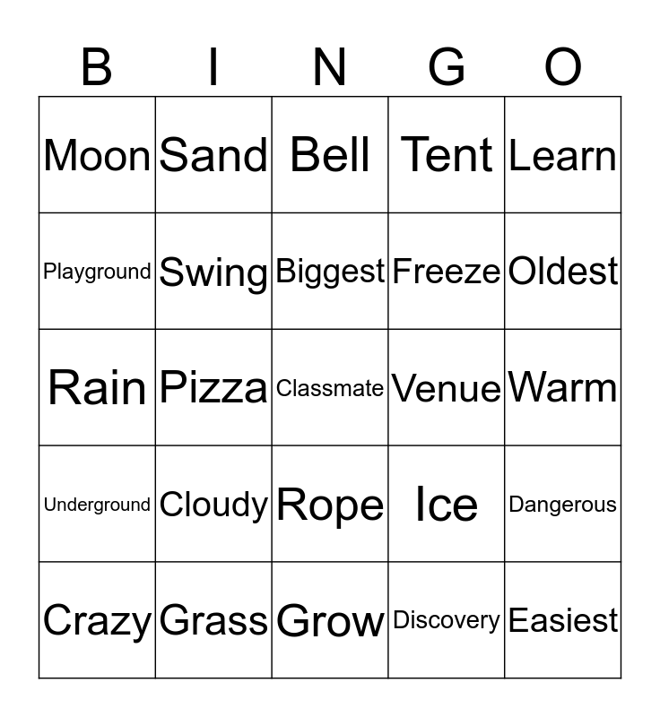 This bingo card has a free space and 24 words: Cloudy, Grass, Biggest, Crazy, Learn, Moon, Playground, Sand, Venue, Rope, Freeze, Rain, Ice, Dangerous, Swing, Discovery, Warm, Bell, Oldest, Pizza, Easiest, Underground, Tent and Grow.