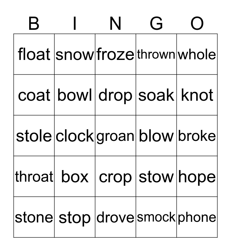 This bingo card has a free space and 24 words: box, stop, drop, stone, whole, float, coat, snow, blow, crop, soak, stole, stow, hope, bowl, smock, broke, froze, knot, clock, phone, throat, thrown and drove.