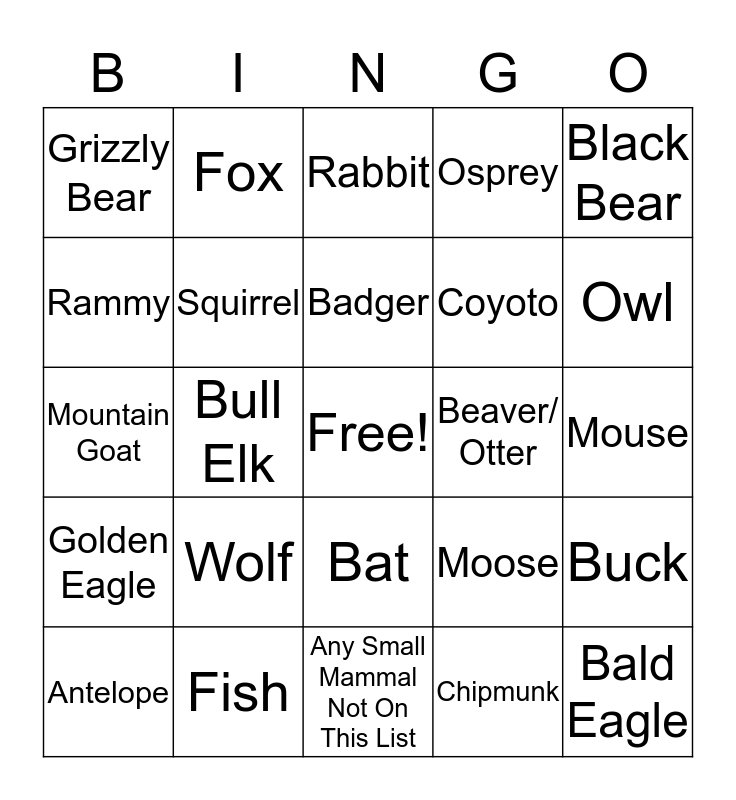 This bingo card has a free space and 24 words: Wolf, Fish, Badger, Antelope, Black Bear, Grizzly Bear, Rammy, Fox, Beaver/ Otter, Bat, Coyoto, Mountain Goat, Moose, Buck, Squirrel, Chipmunk, Mouse, Rabbit, Owl, Bull Elk, Bald Eagle, Golden Eagle, Osprey and Any Small Mammal Not On This List.