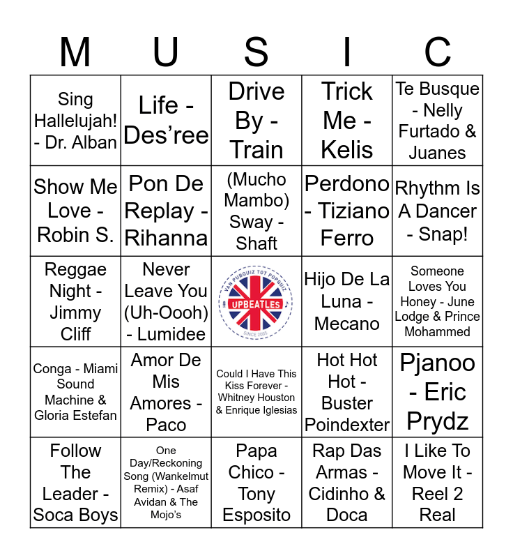 This bingo card has a free space and 24 words: Amor De Mis Amores - Paco, One Day/Reckoning Song (Wankelmut Remix) - Asaf Avidan & The Mojo’s, (Mucho Mambo) Sway - Shaft, Follow The Leader - Soca Boys, Te Busque - Nelly Furtado & Juanes, Sing Hallelujah! - Dr. Alban, Show Me Love - Robin S., Life - Des’ree, Hijo De La Luna - Mecano, Could I Have This Kiss Forever - Whitney Houston & Enrique Iglesias, Perdono - Tiziano Ferro, Reggae Night - Jimmy Cliff, Hot Hot Hot - Buster Poindexter, Pjanoo - Eric Prydz, Pon De Replay - Rihanna, Rap Das Armas - Cidinho & Doca, Someone Loves You Honey - June Lodge & Prince Mohammed, Drive By - Train, Rhythm Is A Dancer - Snap!, Never Leave You (Uh-Oooh) - Lumidee, I Like To Move It - Reel 2 Real, Conga - Miami Sound Machine & Gloria Estefan, Trick Me - Kelis and Papa Chico - Tony Esposito.