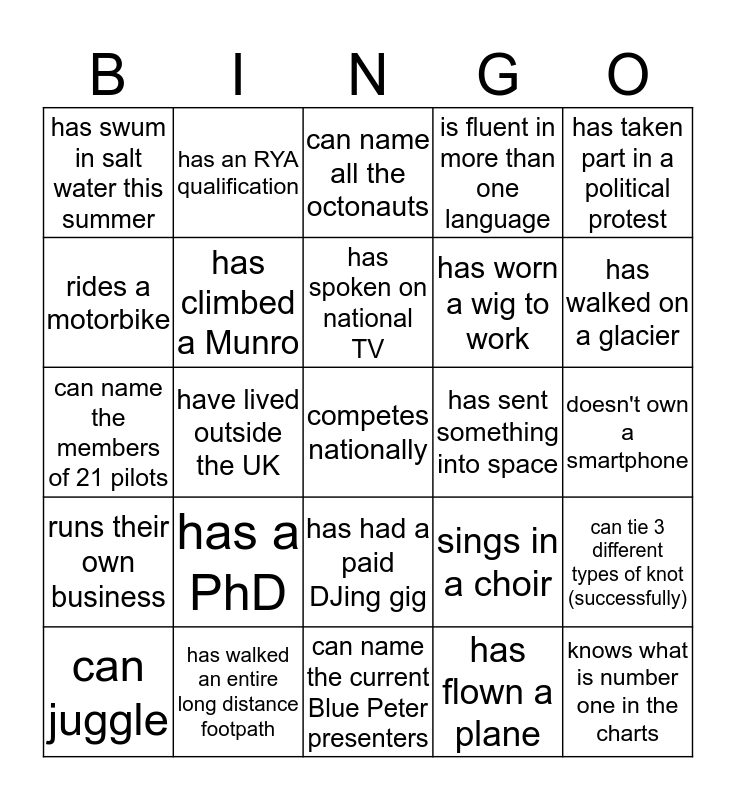 This bingo card has 41 words: Free!, can name the members of 21 pilots, has sailed across the English channel, has climbed a Munro, has walked an entire long distance footpath, has had a paid DJing gig, has spoken on national TV, has featured in a national publication, has taken part in a political protest, runs their own business, have lived outside the UK, is fluent in more than one language, competes nationally, doesn't own a smartphone, has sent something into space, has a PhD, has ridden their bike in the last week, has swum in salt water this summer, has been white water rafting, can name all the octonauts, can tie 3 different types of knot (successfully), knows what is number one in the charts, can name the current Blue Peter presenters, has worn a wig to work, has had their written work published, can split timber with their bare hands, has flown a plane, has been in a band and played a public gig, has walked on a glacier, has been scuba diving, is vegetarian, has an RYA qualification, can juggle, can ride a unicycle, sings in a choir, rides a motorbike, has kept chickens, has passed musical instrument exams, took their GCSEs this summer, took their A levels this summer and has seen a giraffe in the wild.