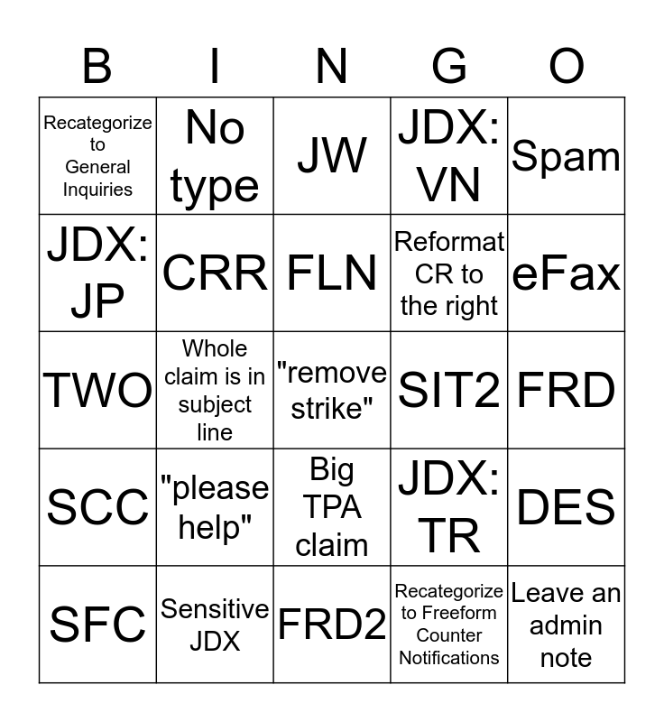 This bingo card has a free space and 24 words: "please help", Sensitive JDX, FLN, SFC, Spam, Recategorize to General Inquiries, JDX: JP, No type, SIT2, Big TPA claim, Reformat CR to the right, TWO, JDX: TR, DES, CRR, Recategorize to Freeform Counter Notifications, FRD, JW, eFax, Whole claim is in subject line, Leave an admin note, SCC, JDX: VN and FRD2.