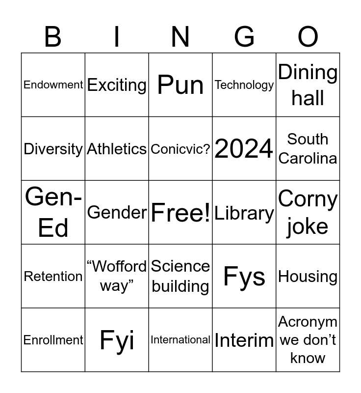 This bingo card has a free space and 24 words: “Wofford way”, Fyi, Conicvic?, Enrollment, Dining hall, Endowment, Diversity, Exciting, Library, Science building, 2024, Gen-Ed, Fys, Housing, Athletics, Interim, Corny joke, Pun, South Carolina, Gender, Acronym we don’t know, Retention, Technology and International.