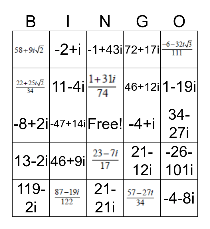 This bingo card has 7 images, a free space and 19 words: -2+i, 34-27i, 21-12i, 46+12i, -8+2i, -26-101i, 119-2i, -47+14i, 26+i, 72+17i, 13-2i, -1+43i, -4-8i, 1-19i, 21-21i, -4+i, 46+9i, 11-4i and 11i.
