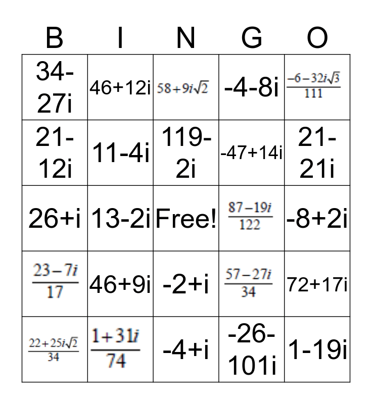This bingo card has 7 images, a free space and 19 words: -2+i, -26-101i, 119-2i, 34-27i, 21-12i, 46+12i, -8+2i, -47+14i, 26+i, 72+17i, 13-2i, -1+43i, -4-8i, 1-19i, 21-21i, -4+i, 46+9i, 11-4i and 11i.