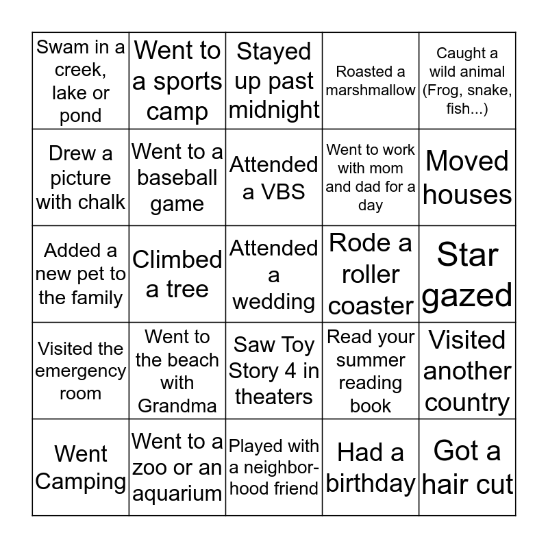 This bingo card has 25 words: Went to the beach with Grandma, Played with a neighbor-hood friend, Attended a VBS, Went Camping, Caught a wild animal (Frog, snake, fish...), Swam in a creek, lake or pond, Drew a picture with chalk, Went to a sports camp, Rode a roller coaster, Saw Toy Story 4 in theaters, Went to work with mom and dad for a day, Added a new pet to the family, Read your summer reading book, Visited another country, Went to a baseball game, Got a hair cut, Star gazed, Stayed up past midnight, Moved houses, Climbed a tree, Attended a wedding, Went to a zoo or an aquarium, Visited the emergency room, Roasted a marshmallow and Had a birthday.