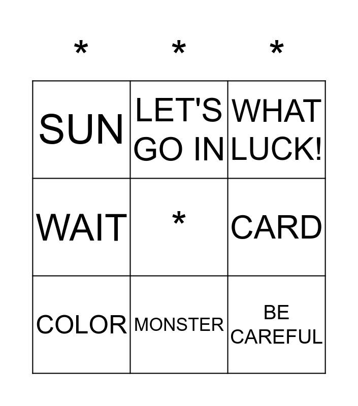 This bingo card has a free space and 26 words: TRAIN, YELLOW, MONSTER, IGLOO, BE CAREFUL, SUN, CARD, LET'S GO IN, WRONG, LAKE, FISH, FISHING POLE, BOOT, BOAT, BIG, DOLLAR, WAIT, I'M TIRED, WHAT LUCK!, FOUR, TWO, FIVE, BALL, LET'S HURRY, COLOR and BLUE.