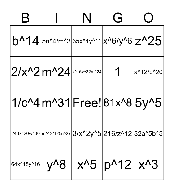 This bingo card has a free space and 29 words: x^7, y^8, 35x^4y^11, a^6, z^25, b^14, m^24, x^16y^32m^24, 81x^8, 32a^5b^5, 64x^18y^16, m^31, p^12, x^3, 1/c^4, 5/x^13, x^5, 216/z^12, a^12/b^20, 243x^20/y^30, m^12/125n^27, 81x^28/16y^48, 1, 5y^5, 2/x^2, 5n^4/m^3, 3/x^2y^5, x^6/y^6 and y^6/16x^18.