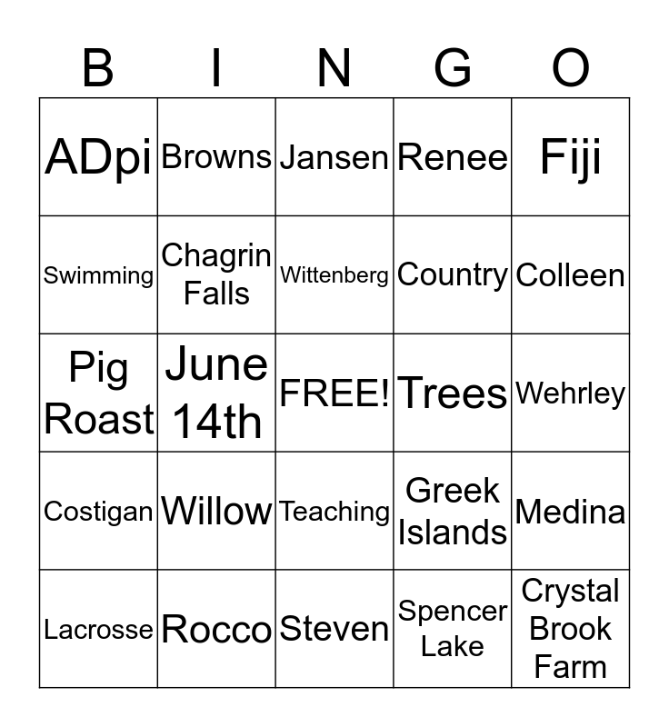 This bingo card has a free space and 24 words: Willow, Rocco, Wittenberg, Lacrosse, Fiji, ADpi, Swimming, Browns, Trees, Teaching, Country, Pig Roast, Greek Islands, Medina, Chagrin Falls, Spencer Lake, Wehrley, Jansen, Colleen, June 14th, Crystal Brook Farm, Costigan, Renee and Steven.