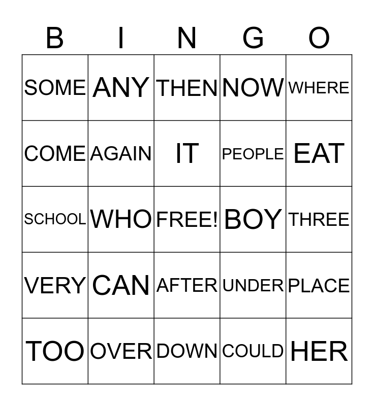 This bingo card has a free space and 24 words: CAN, OVER, IT, TOO, WHERE, SOME, COME, ANY, BOY, AFTER, PEOPLE, SCHOOL, UNDER, PLACE, AGAIN, COULD, THREE, THEN, EAT, WHO, HER, VERY, NOW and DOWN.