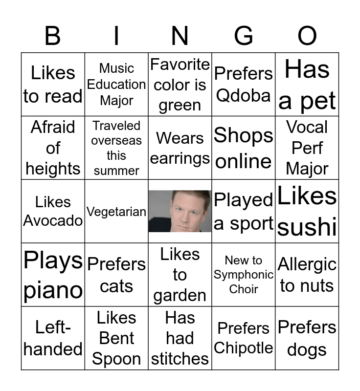 This bingo card has a free space and 34 words: Sang in an opera, Prefers Chipotle, Enjoys cooking, Has been skydiving, Plays piano, Traveled overseas this summer, Has a pet, Left-handed, Music Education Major, Hates Spiders, Wears earrings, Favorite color is green, Only Child, Speaks multiple languages, Played a sport, Vocal Perf Major, Likes Bent Spoon, Likes Avocado, Prefers cats, New to Symphonic Choir, Likes to garden, Does not drink soda, Likes to read, Likes sushi, Has had stitches, Prefers dogs, Prefers Qdoba, Scared of the dark, Shops online, Afraid of heights, Has a tattoo, Vegetarian, Allergic to nuts and Has 3 or more siblings.