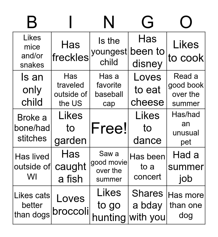 This bingo card has a free space and 29 words: Likes cats better than dogs, Loes to watch sports, Likes to garden, Loves to hike or walk, Likes mice and/or snakes, Is the youngest child, Has traveled outside of the US, Has caught a fish, Likes to dance, Loves broccoli, Has/had an unusual pet, Has more than one dog, Likes to go hunting, Shares a bday with you, Read a good book over the summer, Went on a summer vacation, Saw a good movie over the summer, Has lived outside of WI, Likes to cook, Broke a bone/had stitches, Has been to a concert, Has milked a cow, Loves to eat cheese, Is an only child, Has been to disney, Has freckles, Had a summer job, Has a favorite baseball cap and Has driven or ridden on a tractor.